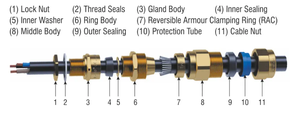 The E* Series double compression cable glands maintain Flameproof Exd and Increased Safety Exe methods of explosion protection IP67. Reversible Armour Clamping Ring (RAC) allows use with, Steel & Aluminium Wire Armoured, braided, lead sheathed braided, tape or flat steel wire armoured cable according next types of E* Series Cable Gland: